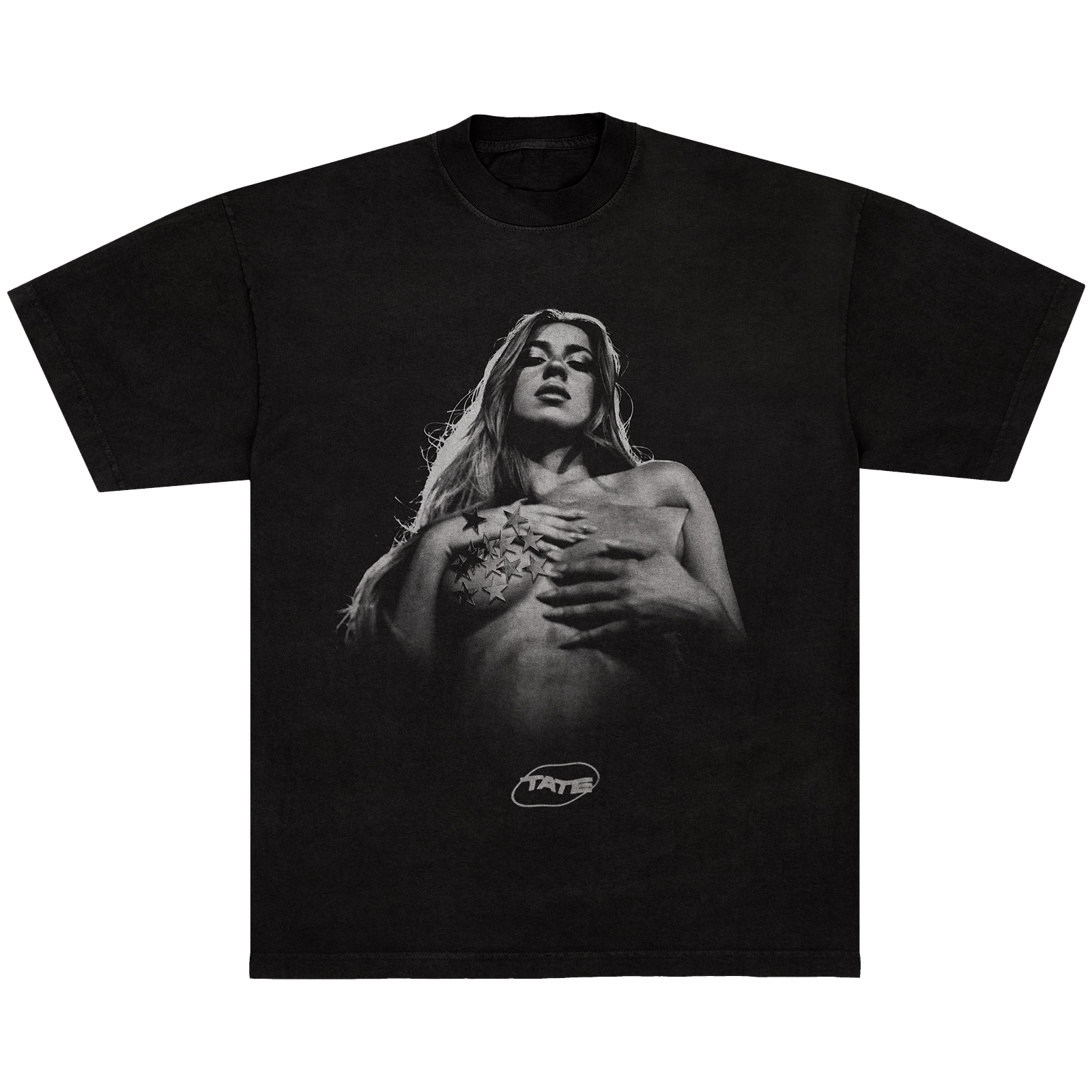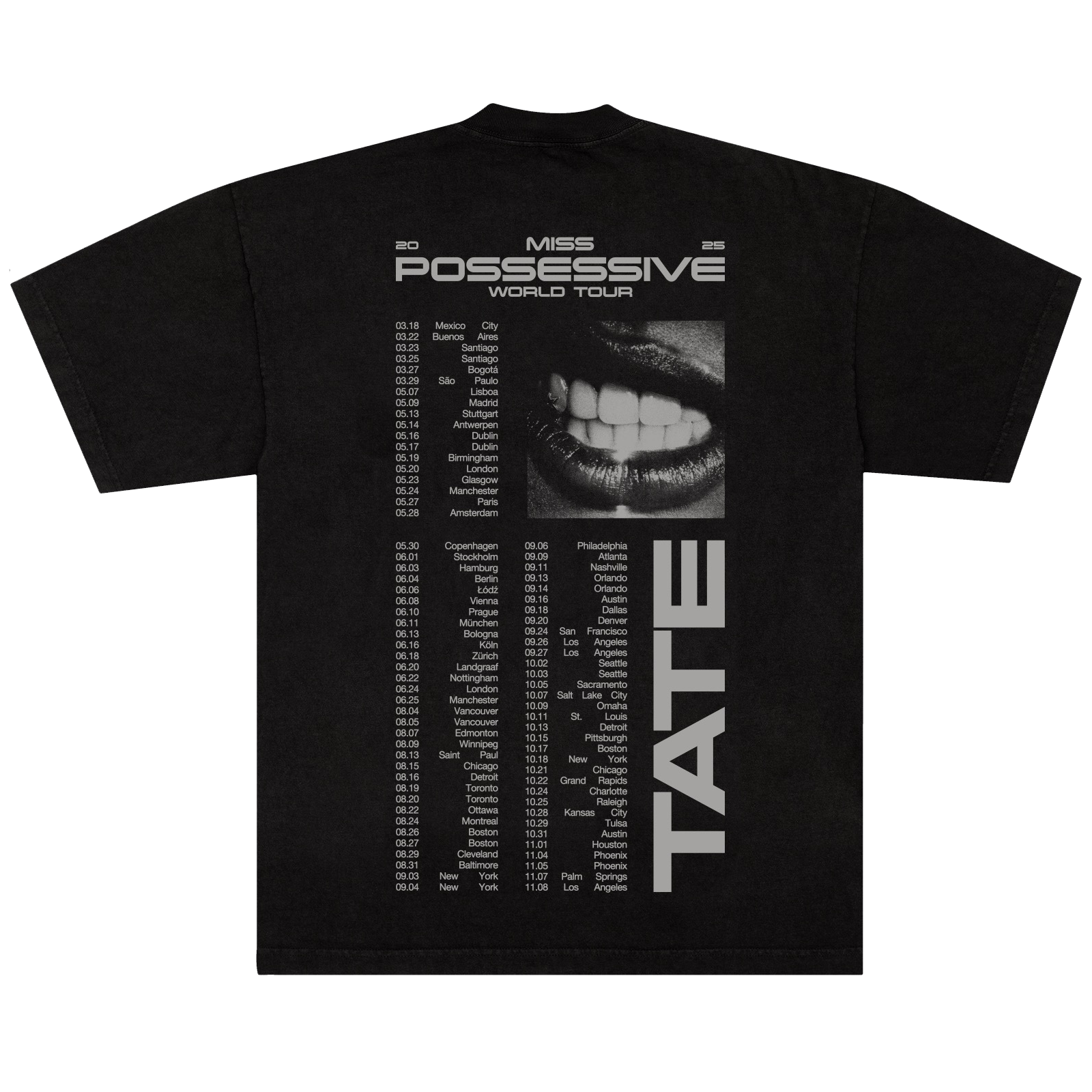 Black 100% cotton unisex short sleeve tee with Pose artwork on the front and T8 Lips artwork and Miss Possessive World Tour dates on the back