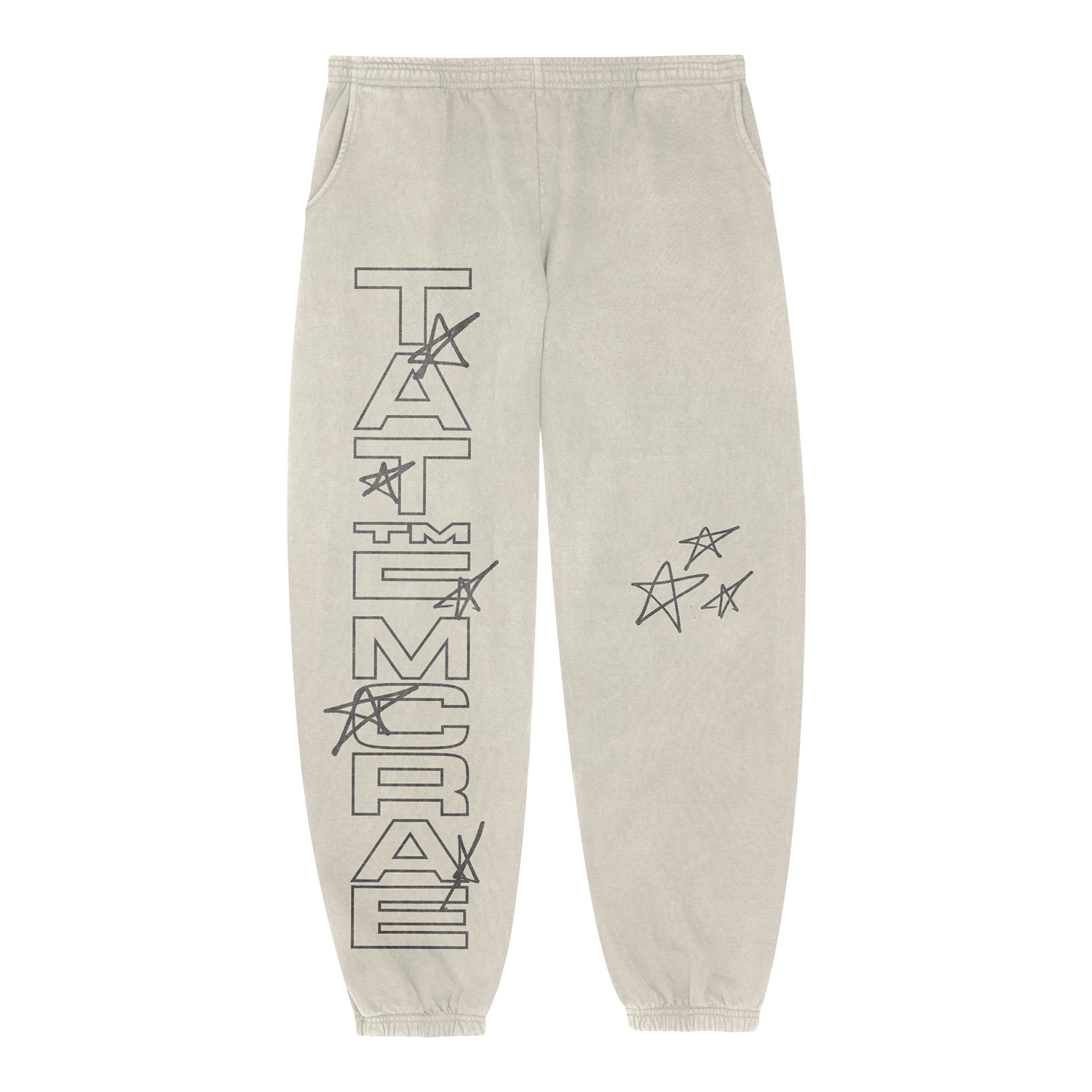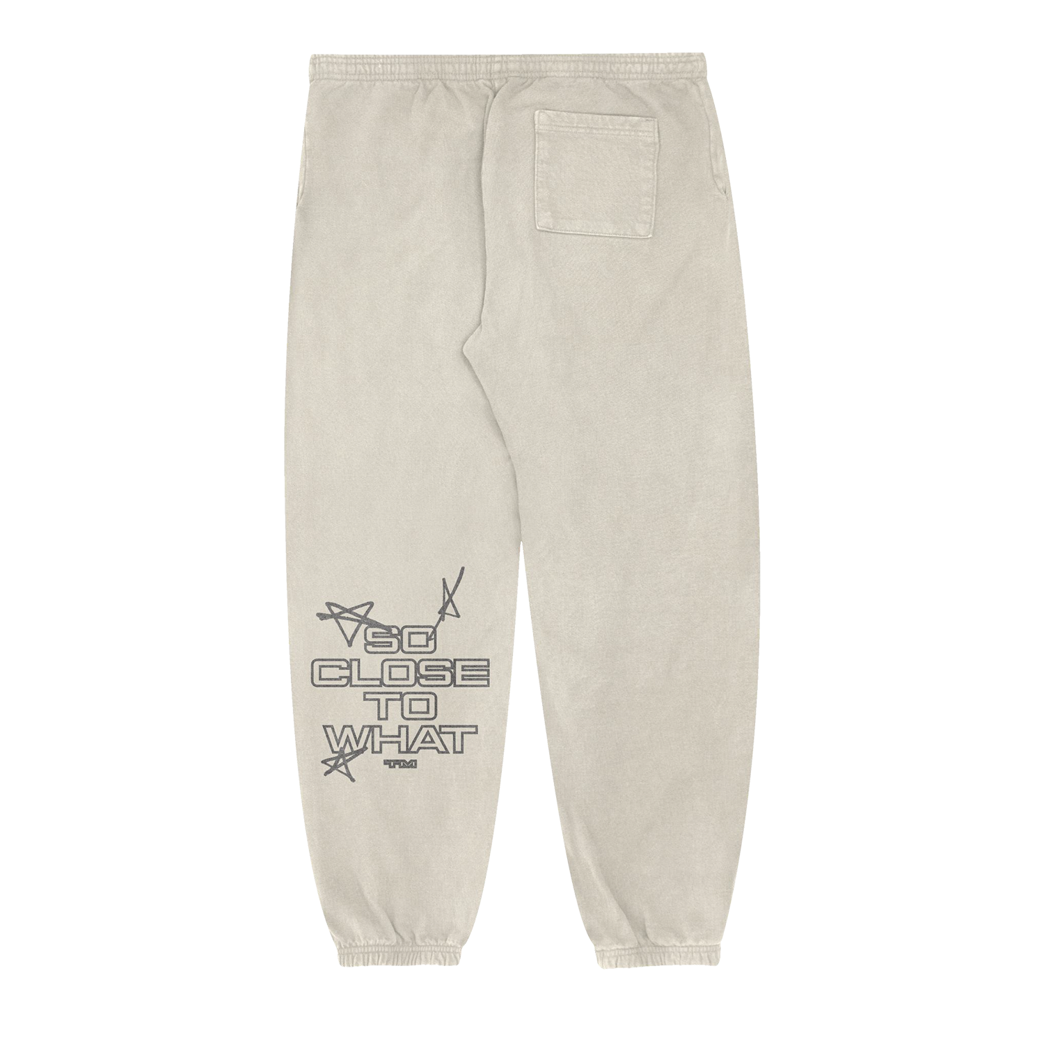 Gray sweatpants with TATE MCRAE on the front right pant leg and SO CLOSE TO WHAT on the back left leg